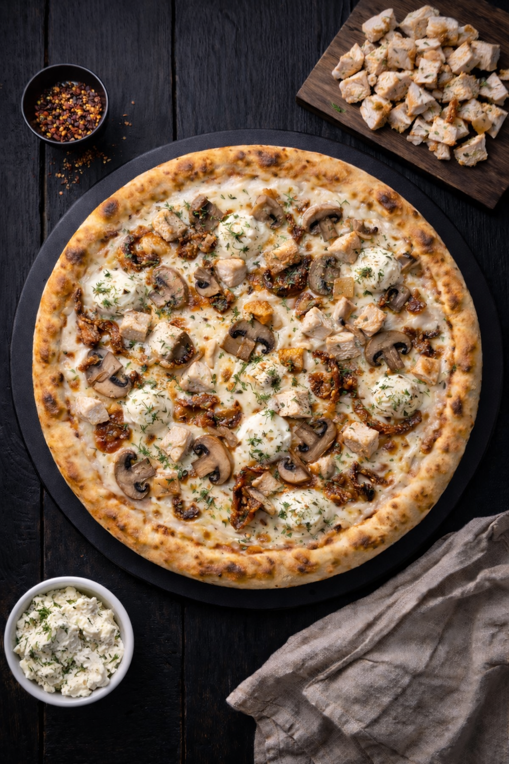 Crème, Mozzarella, Fromage ail et fines herbes, Poulet, Champignons, Oignons confits, Origan
